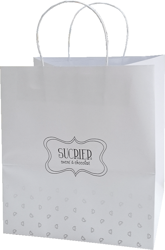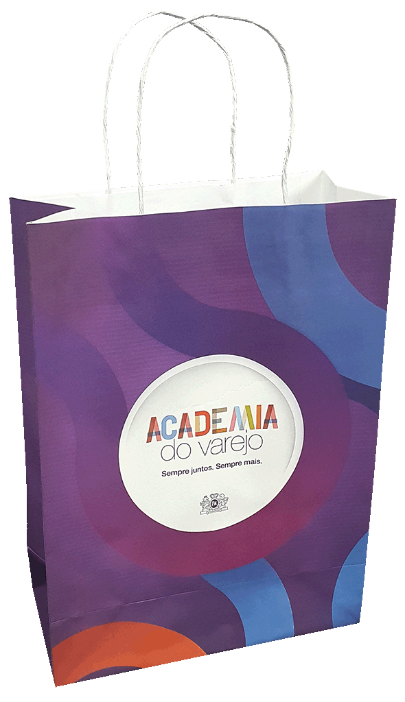 impressa em papel offset ou kraft com reforço de fundo e alça de papel torcido.