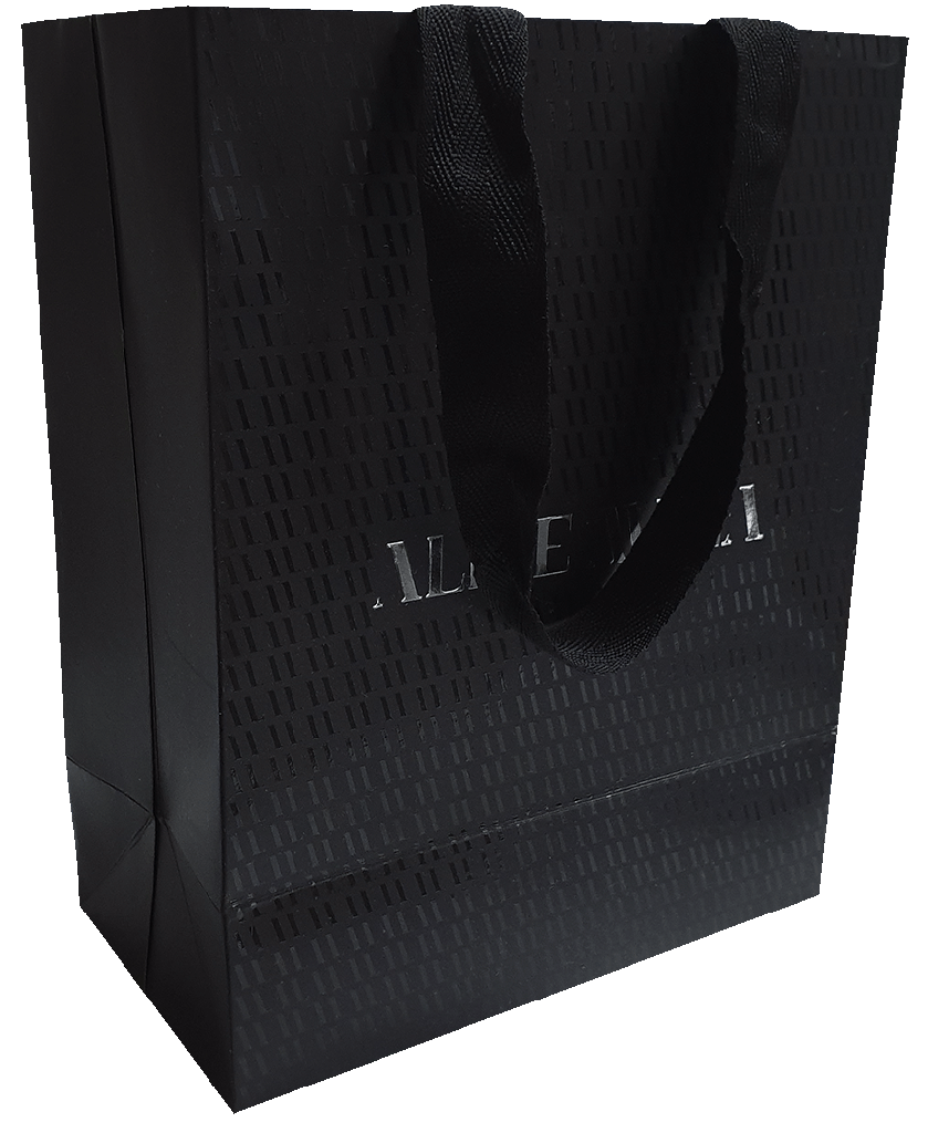 Sacola impressa em papel cartão triplex com alças de gorgurão embutidas, laminação fosca, hotstamping prata e baixo relevo. Reforços de fundo e de alça.