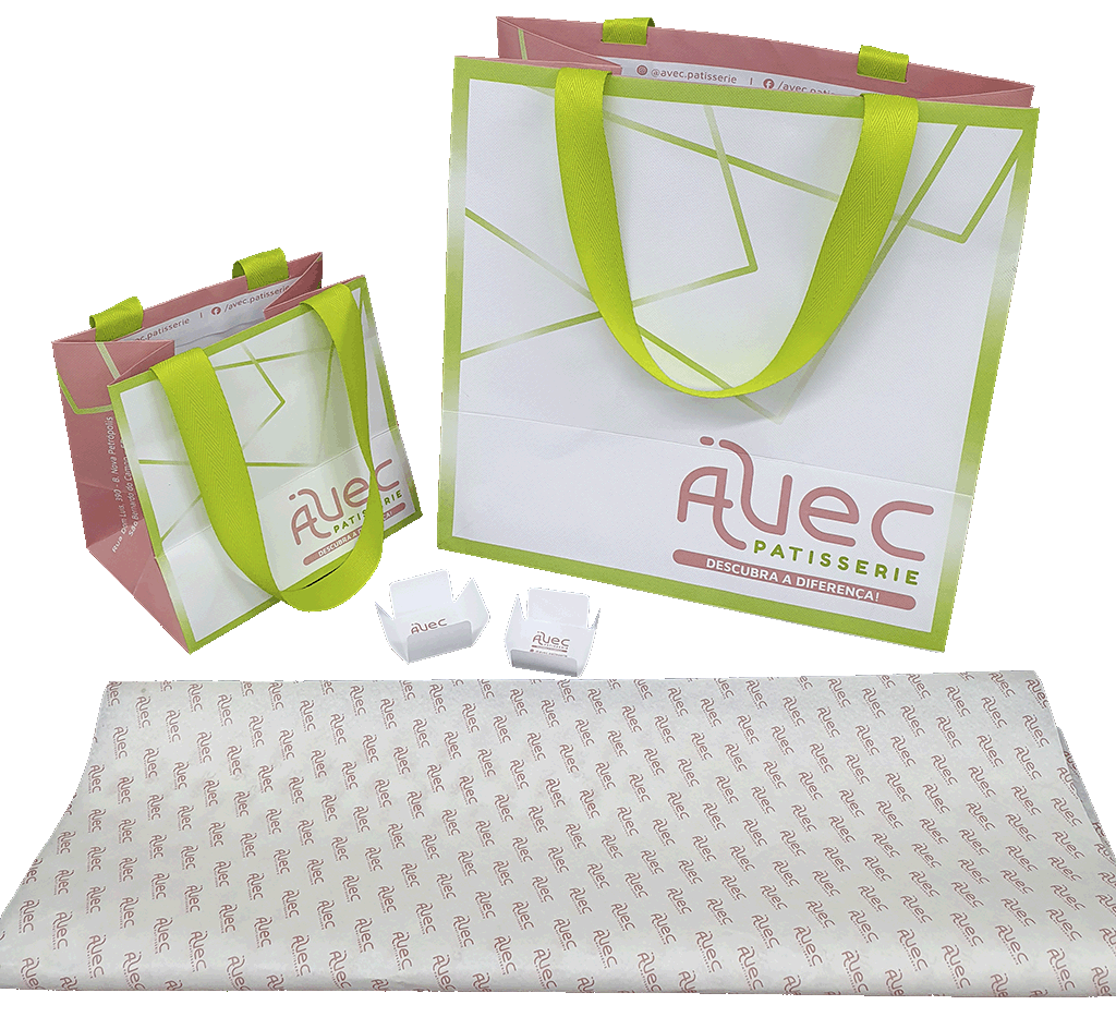 Sacola impressa em papel offset com fundo largo para acondicionamento de caixas para doces e papel de seda personalizado.