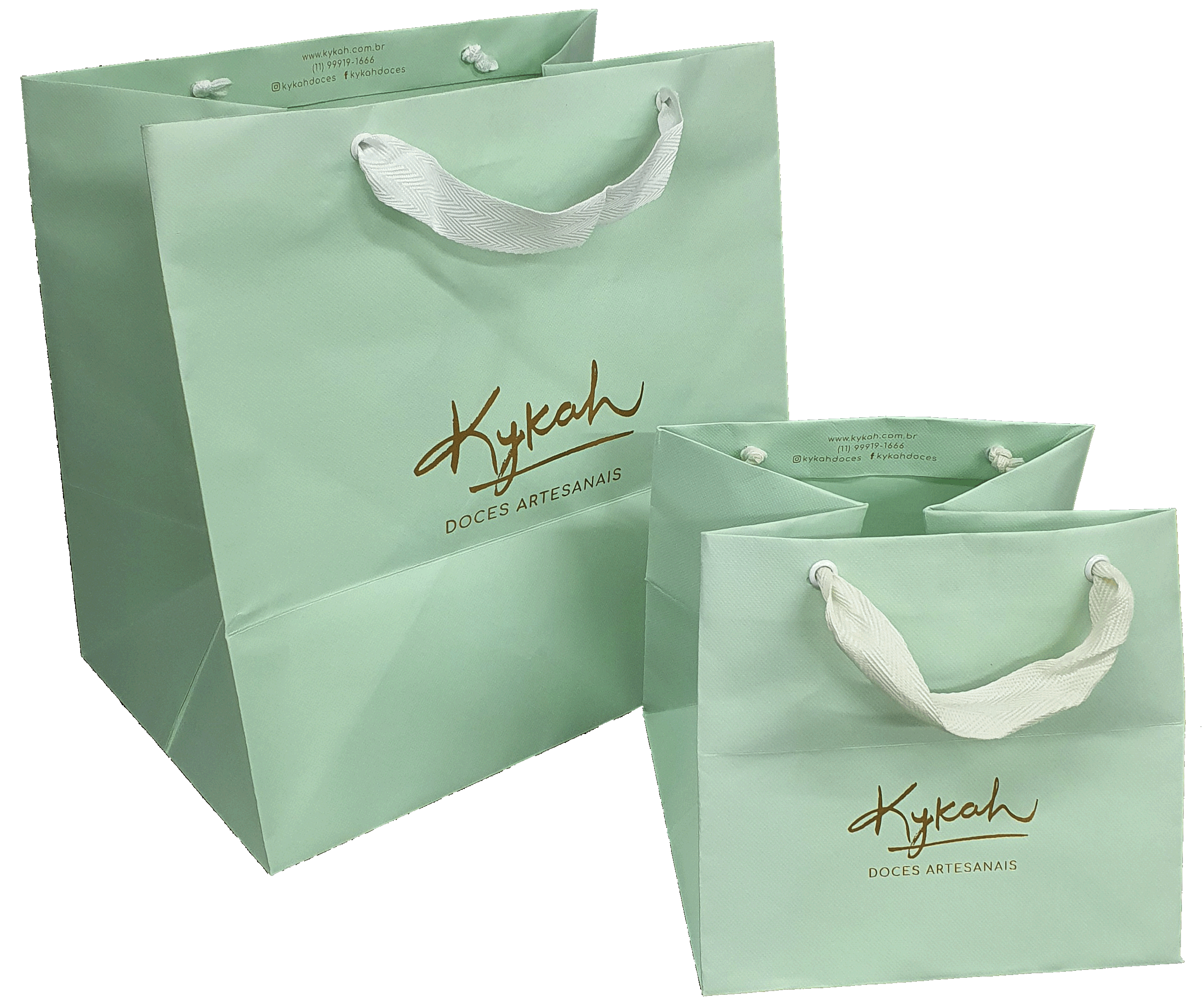 Sacola impressa em papel color plus com aplicação de HotStampig Cobre, possue o fundo largo para acondicionar caixas de doces. Acabamento com alça em gorgurão com ilhós.