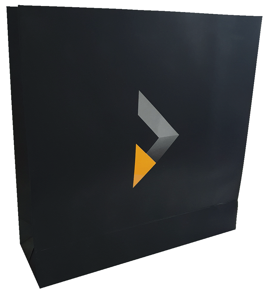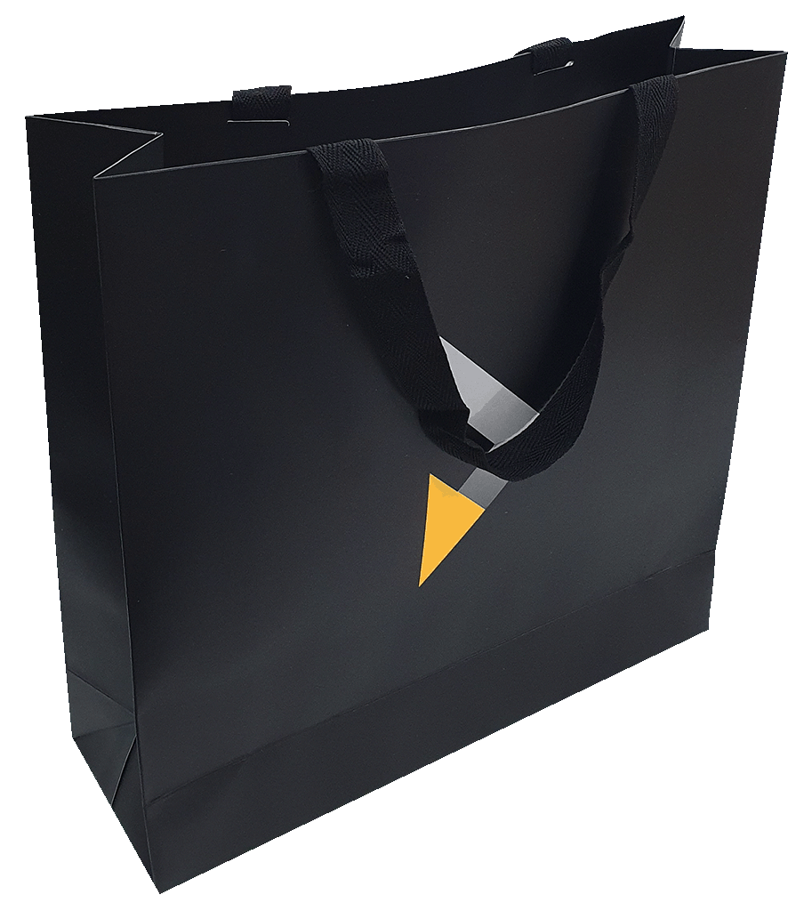 Sacola impressa em papel cartão triplex com alças de gorgurão embutidas, laminação fosca, verniz UV localizado. Reforços de fundo e de alça.