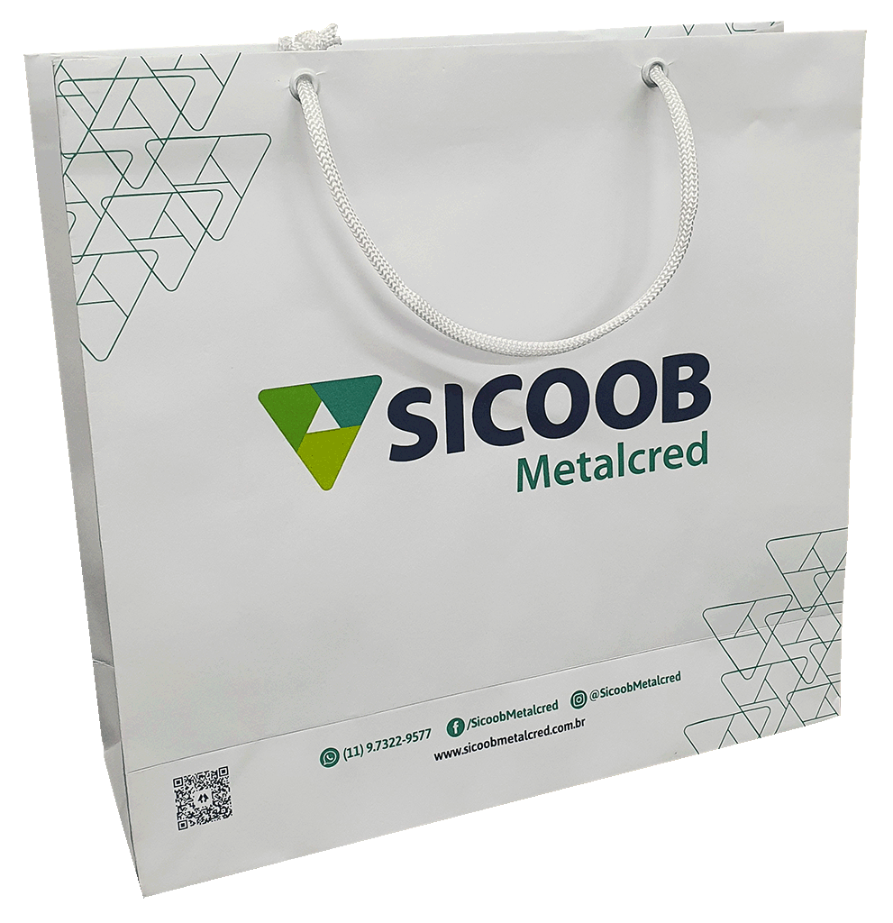 Sacola impressa em papel offset com ilhós metálico e alças de cordão de nylon. Reforços de