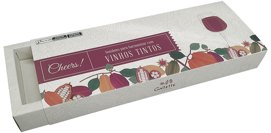 Embalagens tipo gaveta para chocolates, doces e bombom, com acabamento em laminação fosca e aplicação de textura.