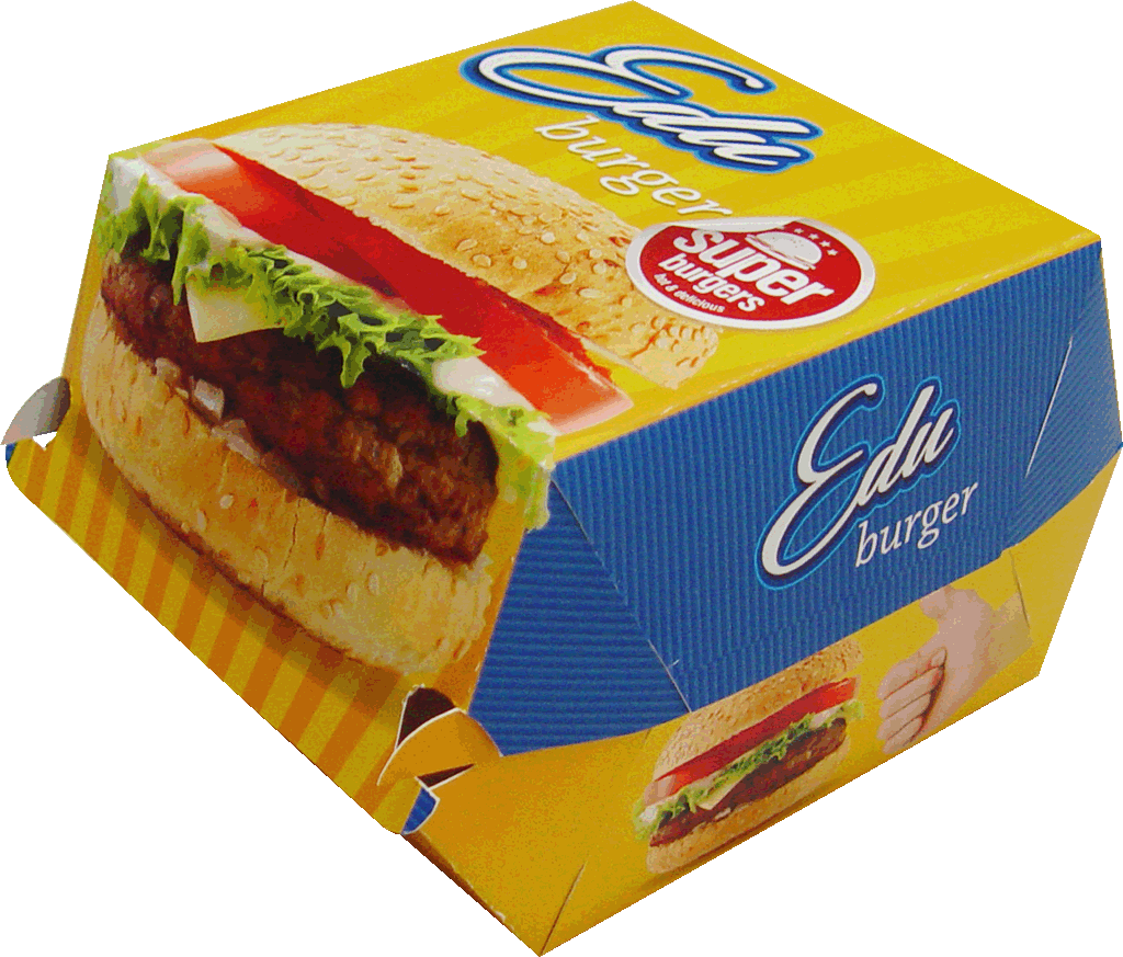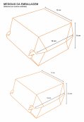 Embalagens para hamburguer e lanches impressas em papel cartão próprio para contato direto com alimentos.
