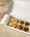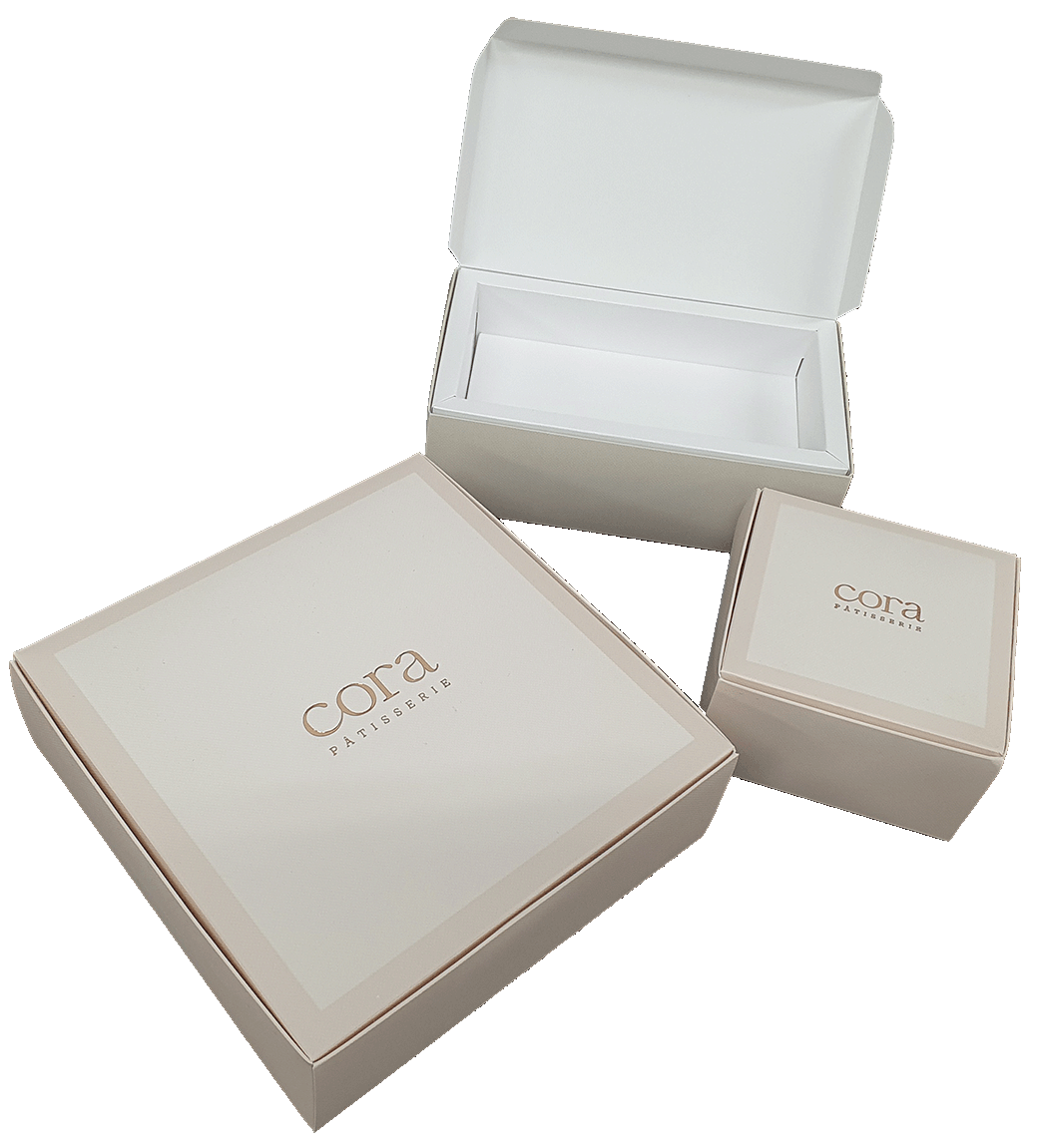 doces e bombom, com acabamento em laminação fosca e aplicação de hotstamping rosê