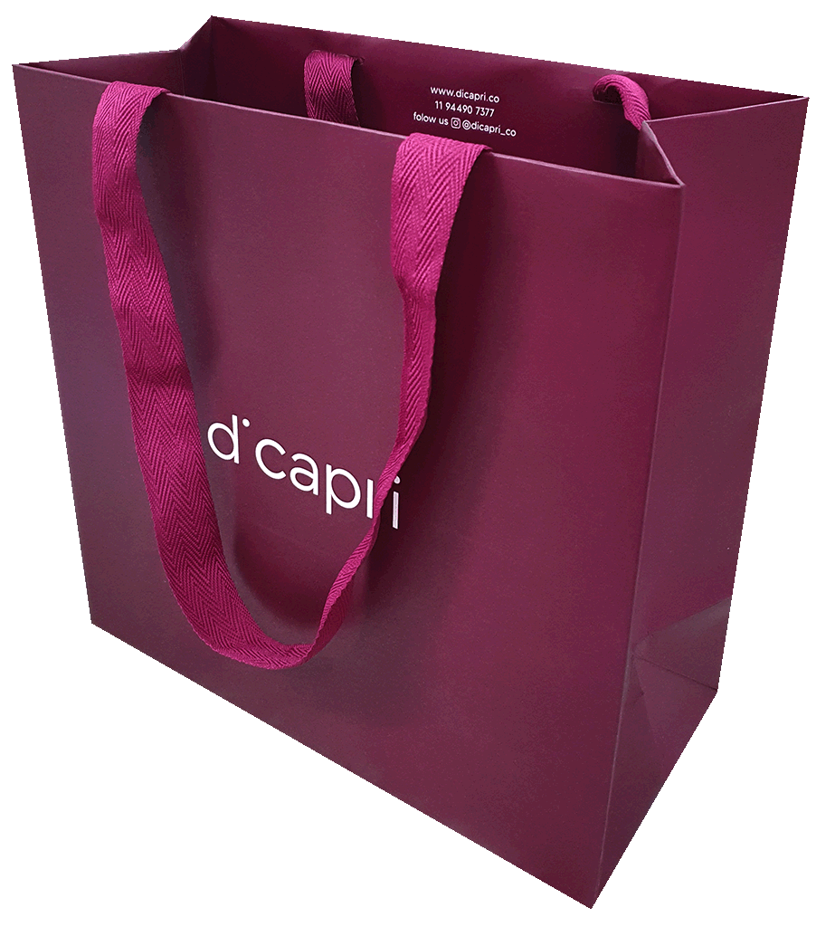 Sacola personalizada impressa em cartão triplex com laminação fosca e verniz UV localizado sobre o logotipo, impressão na parte interna e acabamento de alças de gorgurão embutida.